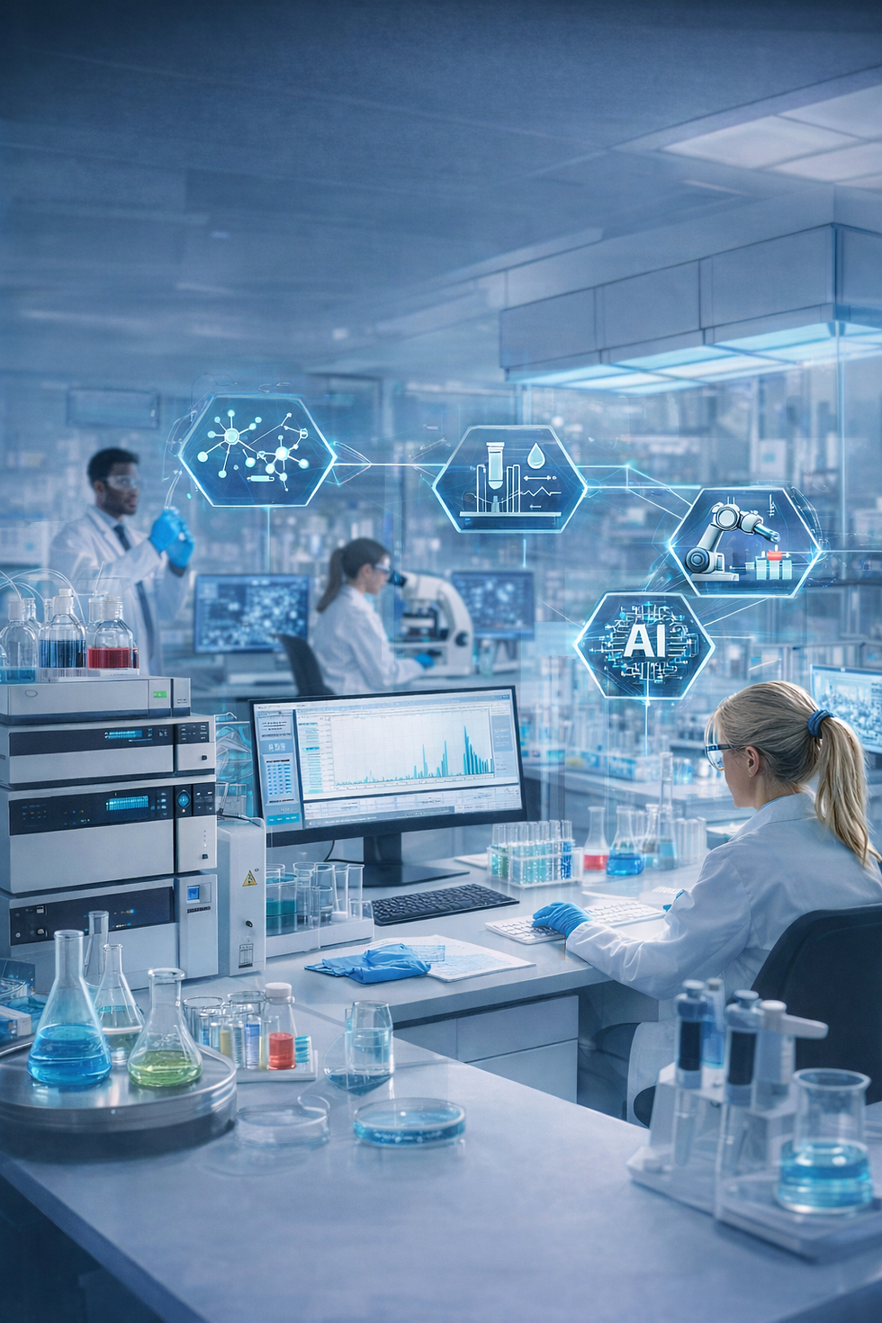 Automação reduz erros humanos e acelera o processamento de amostras. Algoritmos de inteligência artificial ajudam a interpretar grandes volumes de dados, detectar padrões complexos, prever falhas e otimizar protocolos analíticos, aumentando confiabilidade e eficiência.